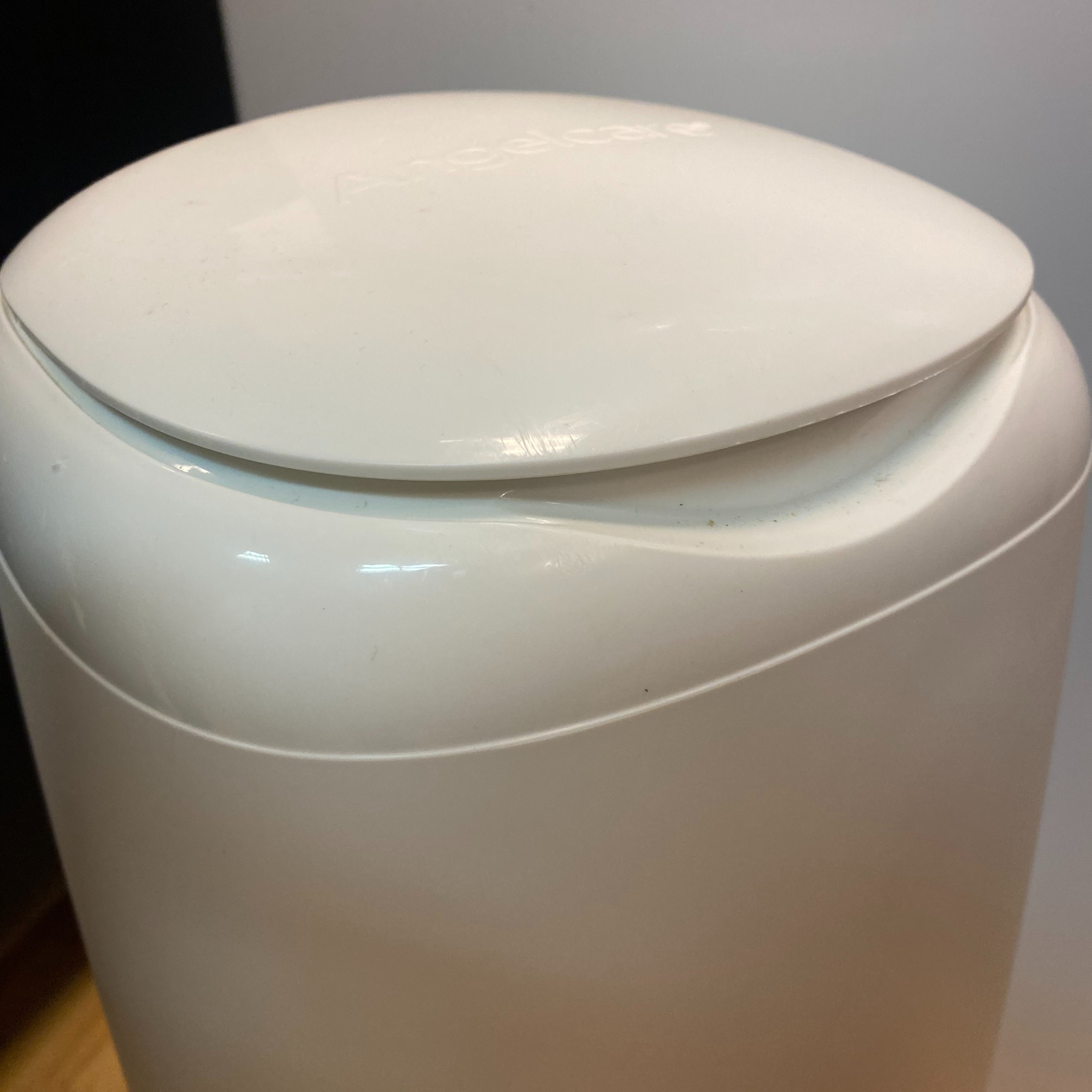 Det finns för mycket påsmaterial som hindrar hinken från att stängas helt. I vissa fall kommer detta att synas tydligt från utsidan, som illustreras på bild 4, medan hinken i andra fall kan verka stängd, men det kan fortfarande finnas en läcka på en eller flera sidor av locket. Andra orsaker till läckage vid den yttre stängningsmekanismen kan vara ett trasigt lock, främmande föremål som har fastnat och hindrar mekanismen från att stängas, eller felaktig montering av påsen som gör att den sitter för högt för att hinken ska kunna stängas helt.